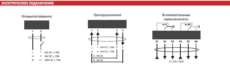 Модель имеет один концевой выключатель - SPDT (Single Pole, Double Throw "Один полюс, два направления"). Вспомогательные переключатели позволяют сигнализировать о положении заслонки.