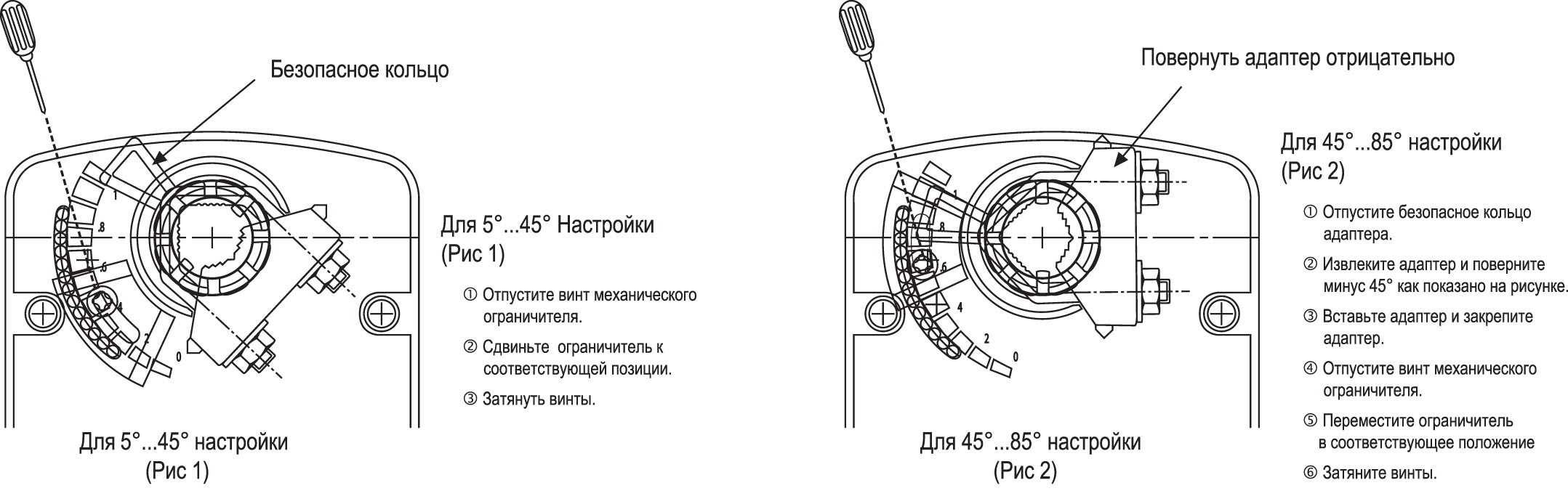 Привод обеспечивает угол поворота до 90 градусов с шагом 5 градусов. Данная модель рассчитана на 60 000 циклов. Устройство оснащено возвратной пружиной и вспомогательными переключателями.