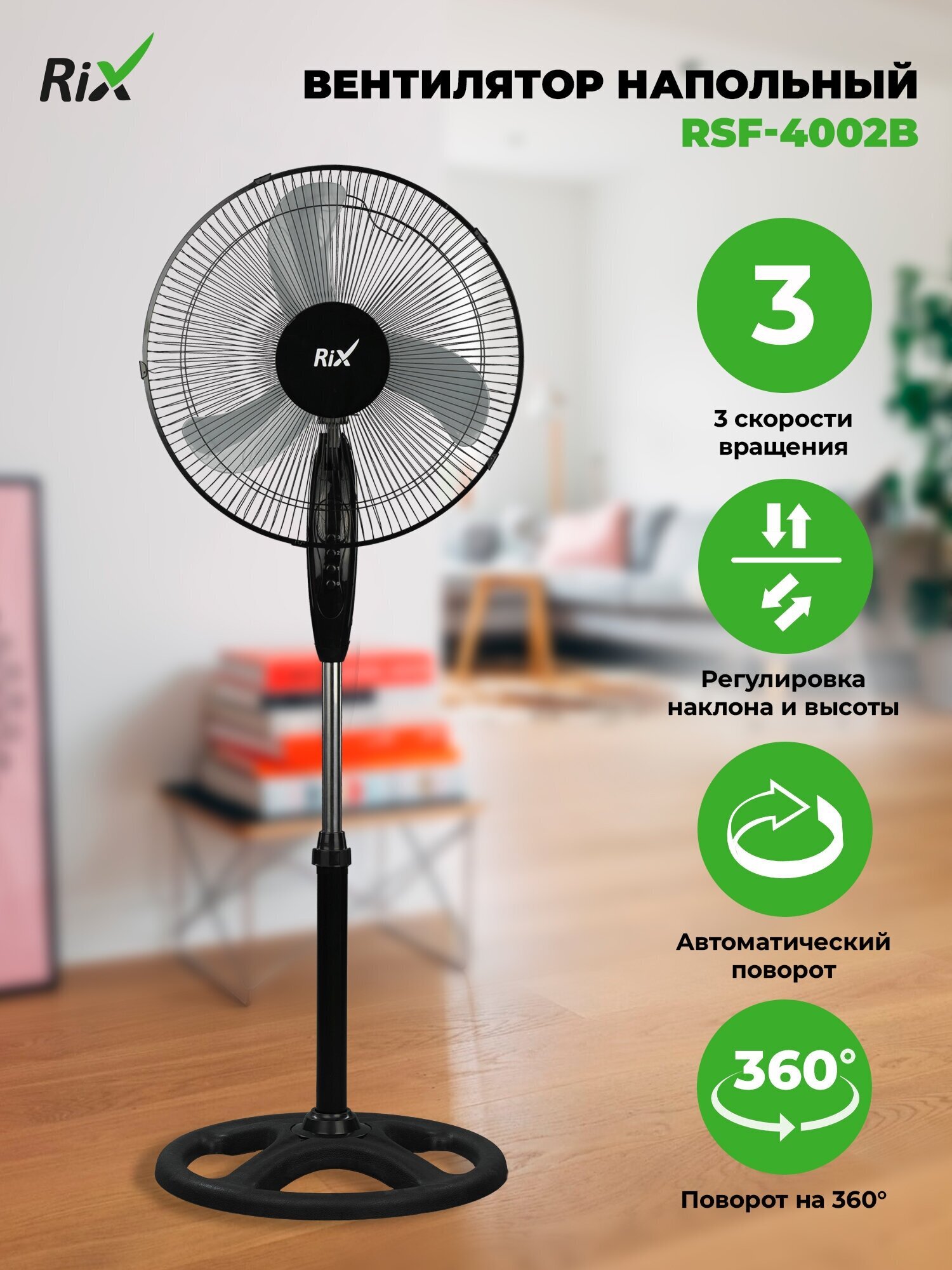 Напольный вентилятор Rix RSF-4002W, RSF-4002B – современный и надежный прибор охлаждения воздуха. Вентилятор Rix RSF-4002 оснащён круглым устойчивым основанием, которое исключает опрокидывание прибора и двойными ребрами жесткости защитной решетки с увеличенным количеством прутьев.